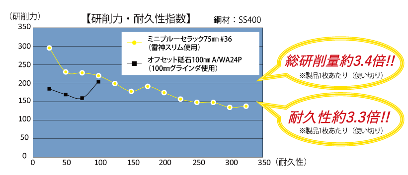 ※当社実験値。100㎜オフセット砥石 A/WA24Pの耐久性を100とする。